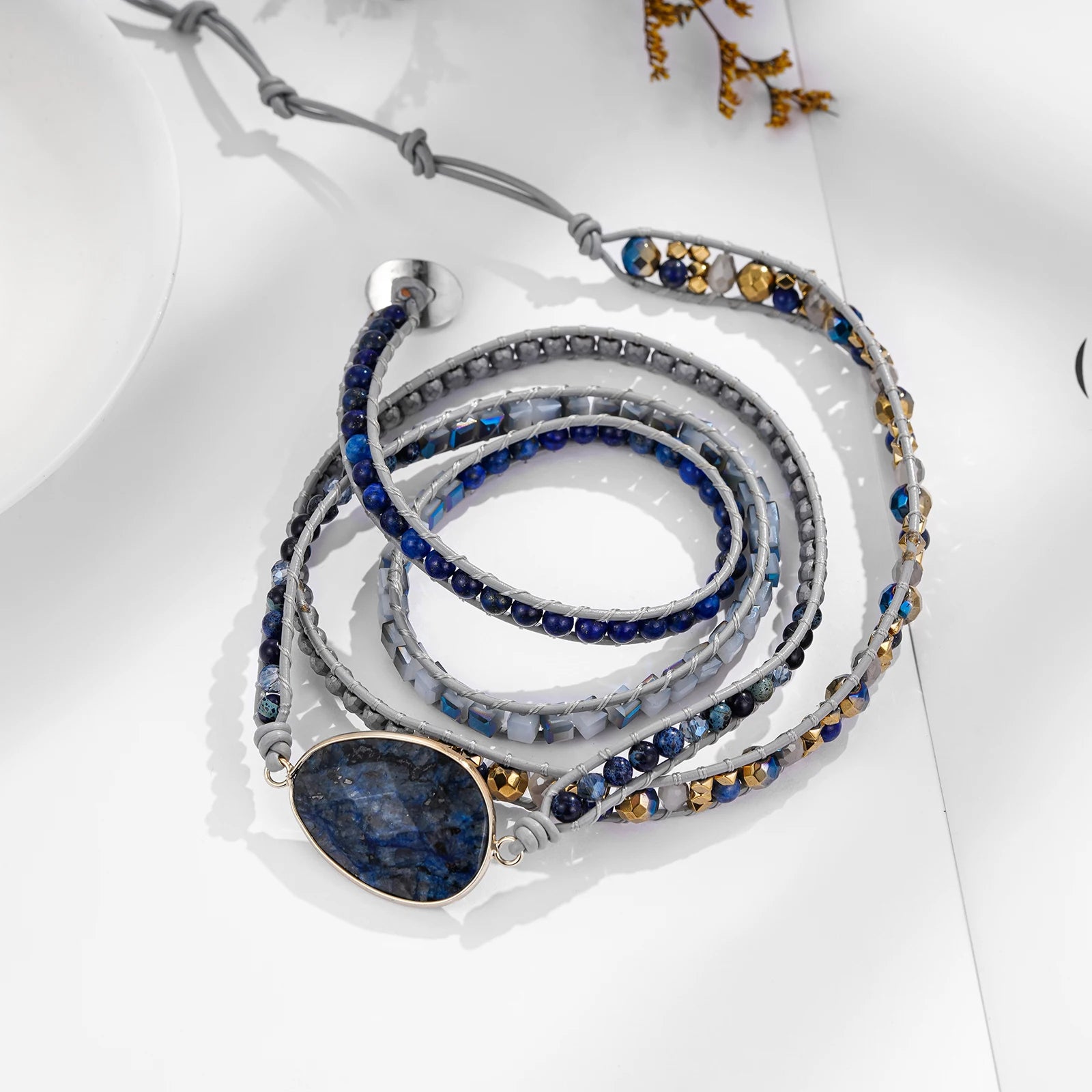 Elevate your style and energy with this handcrafted Natural Blue Labradorite Wrap Bracelet. Designed with high-quality natural stones, shimmering crystals, and durable leather, this 5-strand bracelet is a stunning blend of bohemian fashion and spiritual healing.